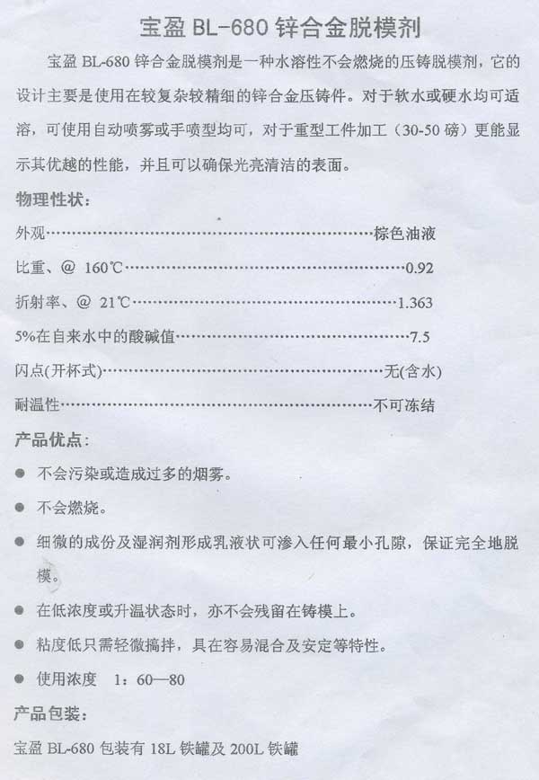 BL—680锌合金脱模剂